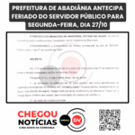 PREFEITURA DE ABADIÂNIA ANTECIPA FERIADO DO SERVIDOR PÚBLICO PARA SEGUNDA-FEIRA, DIA 27/10